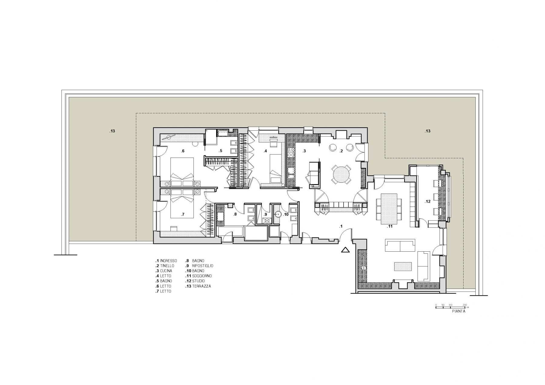 L’impianto planimetrico dell’abitazione è regolare, studiato sullo sviluppo di un asse principale che taglia in senso longitudinale tutto l’appartamento e pone visivamente in continuità le parti estreme dell’abitazione, conferendo un senso di sviluppata spazialità basato sulla grande profondità.