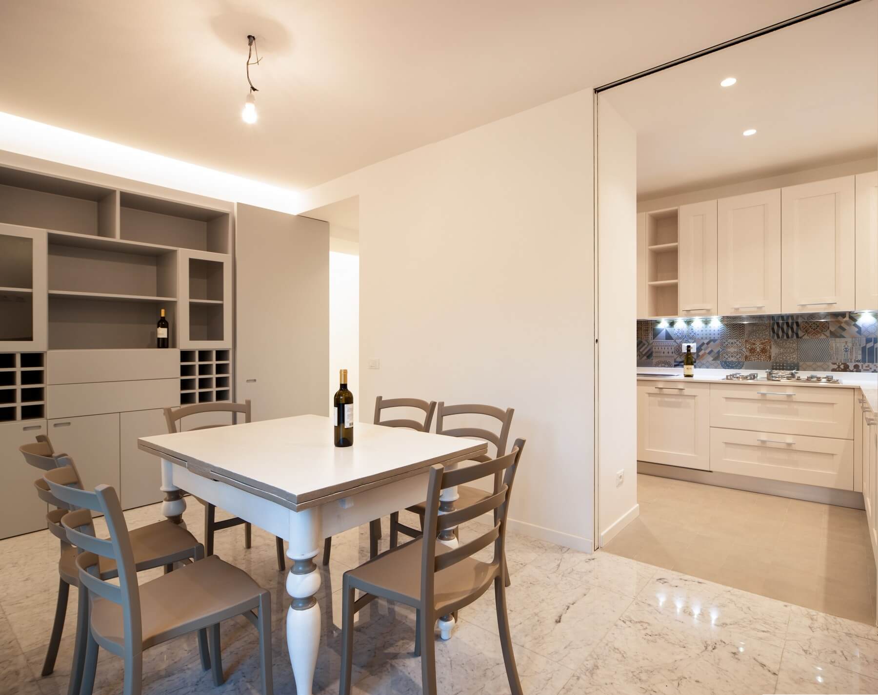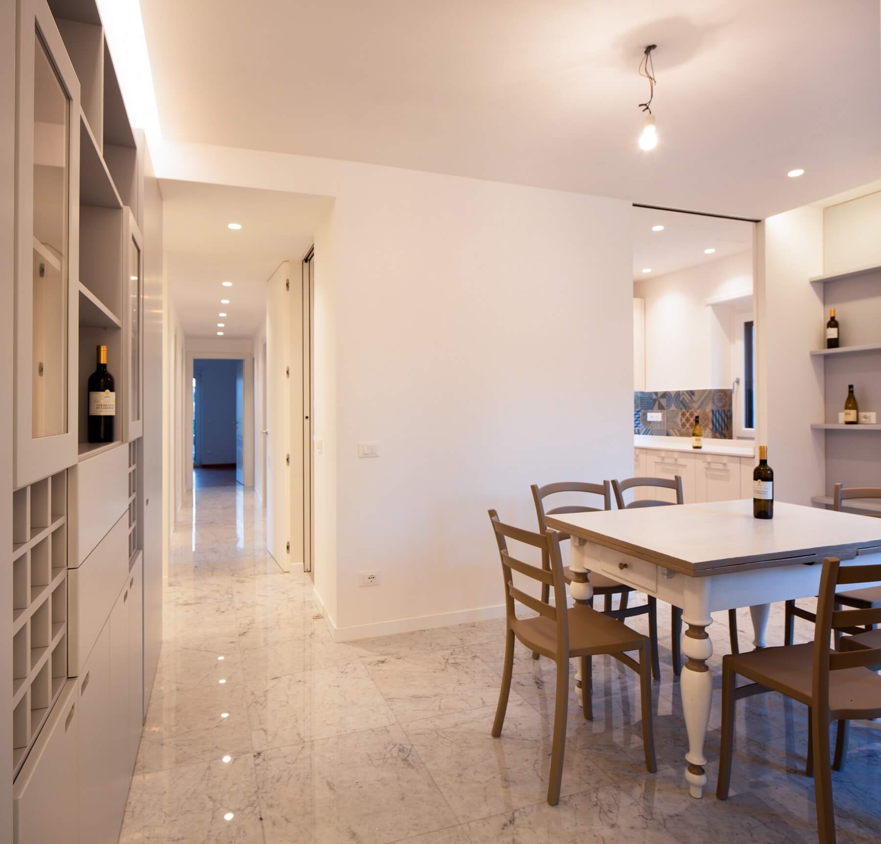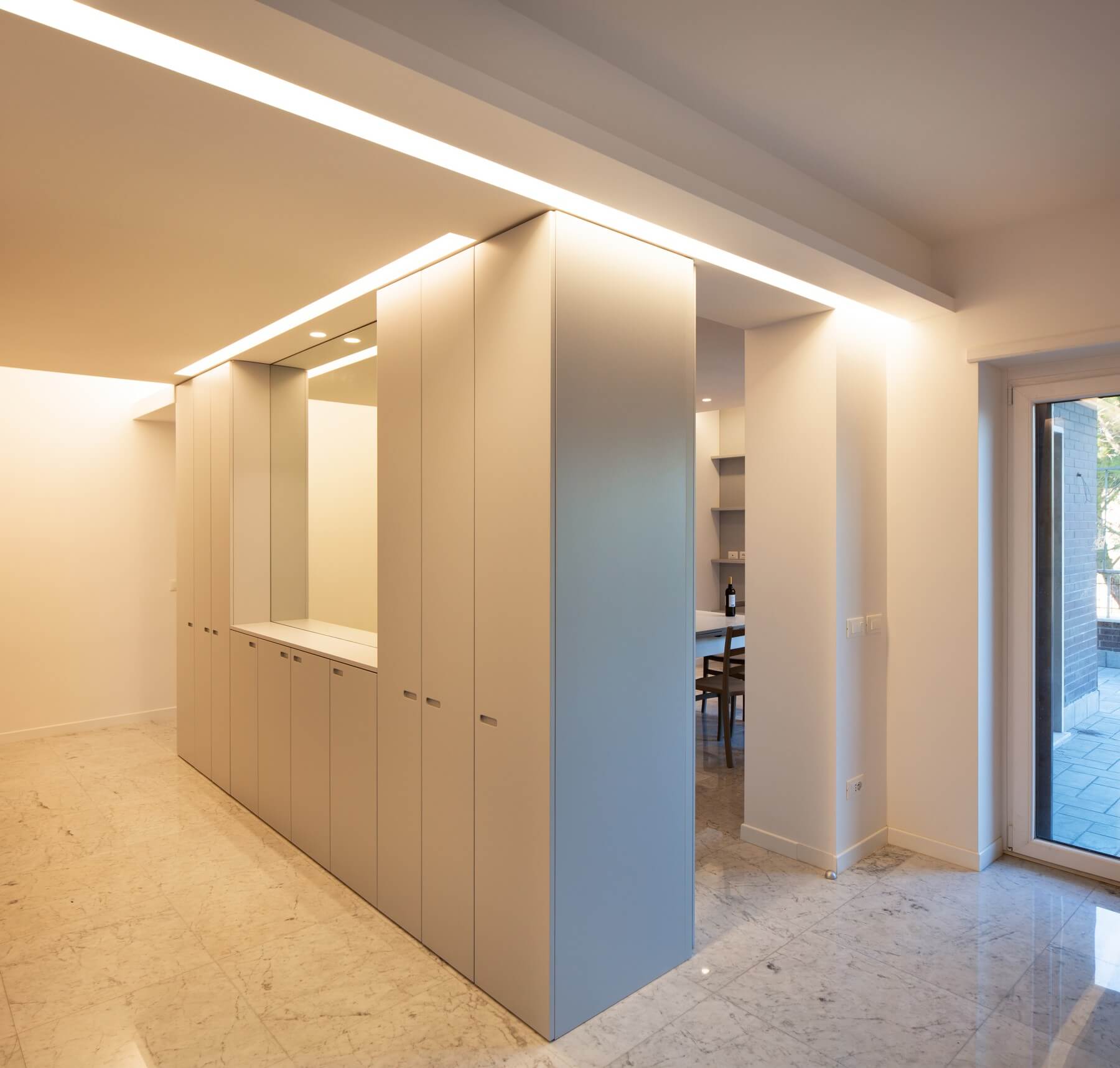 Il monolite nell’ambito dell’ingresso funziona come guardaroba mentre dalla parte opposta come servizio della zona pranzo.