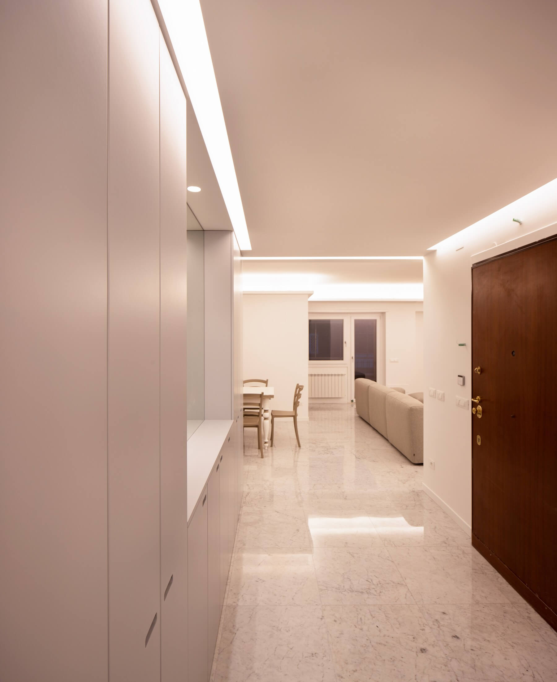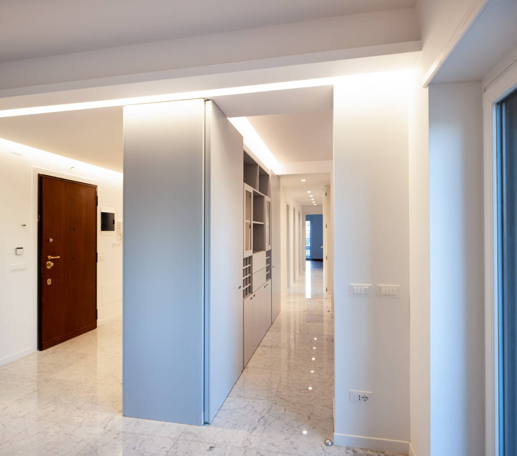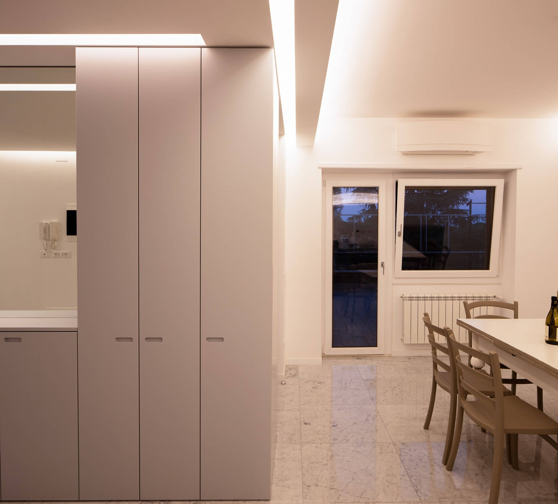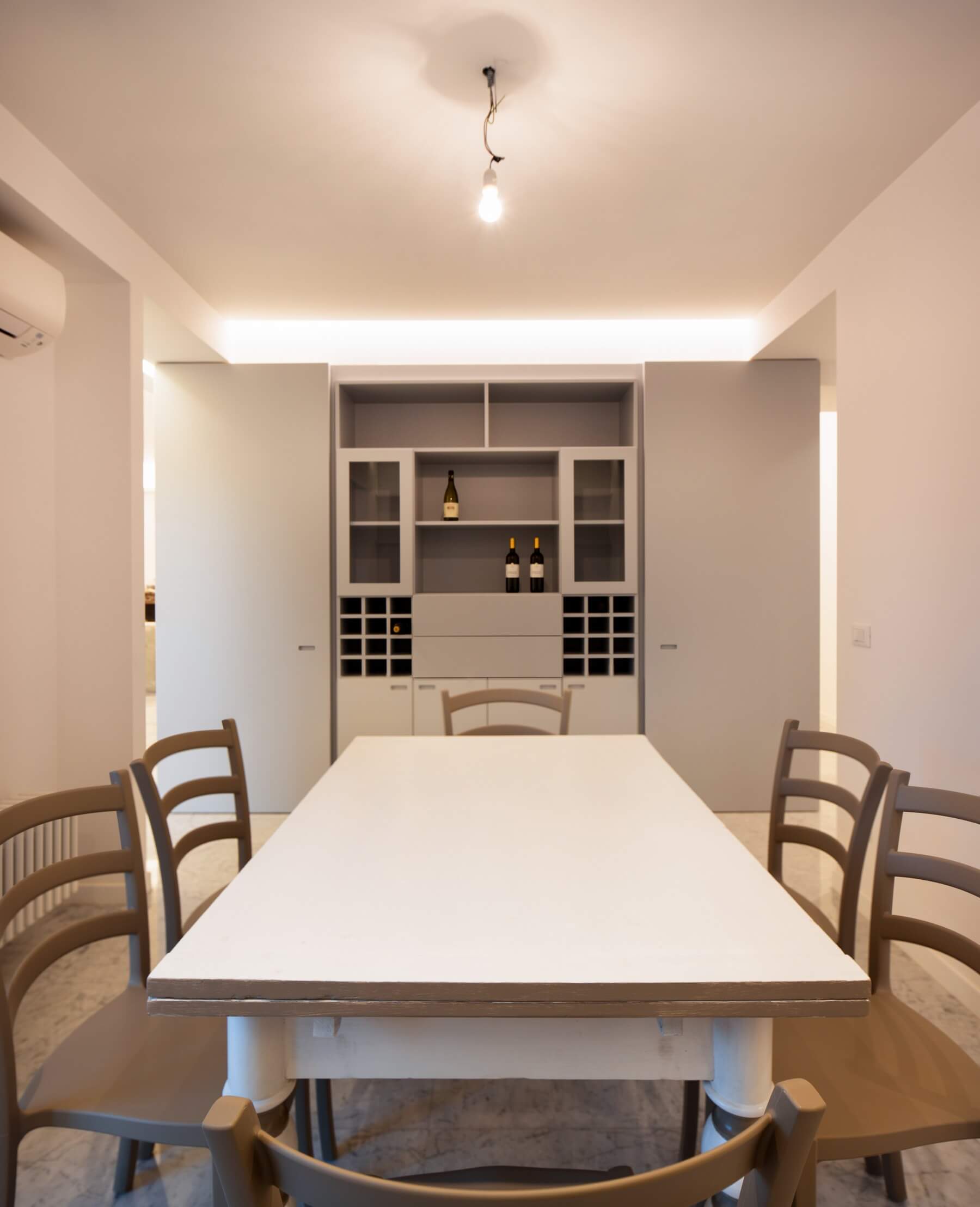 Il monolite nell’ambito dell’ingresso funziona come guardaroba mentre dalla parte opposta come servizio della zona pranzo.