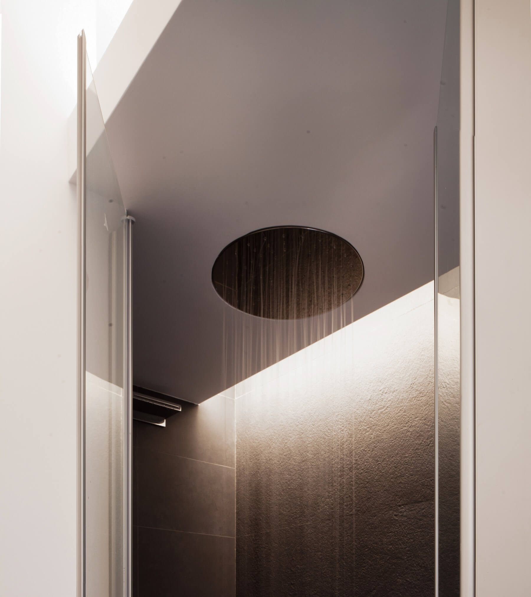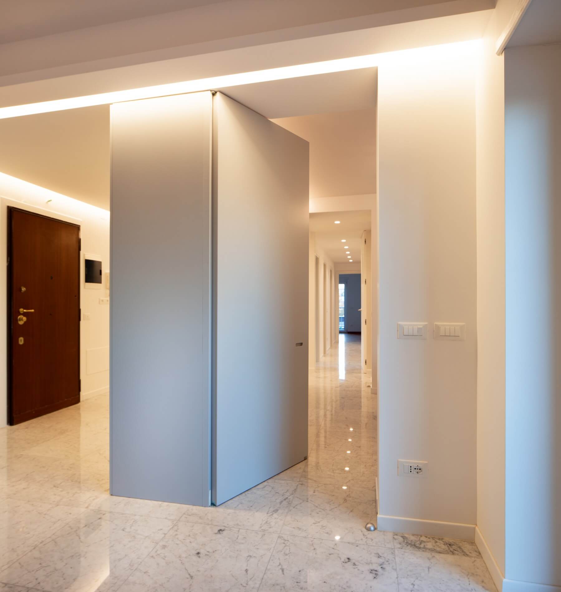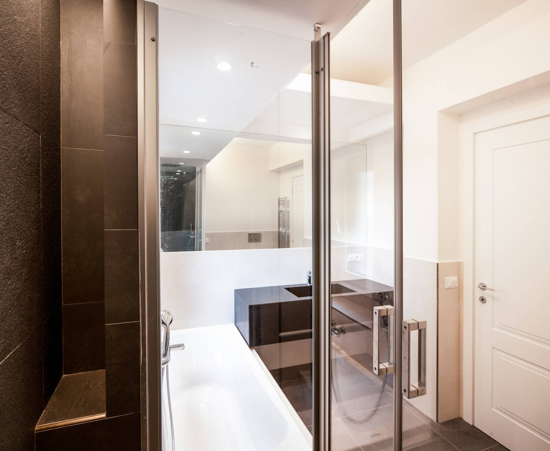 Il monolite come gli altri elementi d’arredo si riflette nelle lastre lucide di marmo Carrara “c” come in uno specchio d’acqua favorendo una forte diffusione luminosa. Leggerezza, evanescenza, riflessione e la forte diffusione luminosa si contrappongono alla massività dell’elemento d’arredo pieno creando un gioco di alternanza tra volumi e vuoti. Tagli luminosi delimitano le transizioni tra le diverse quote dei controsoffitti che caratterizzano gli ambienti. Per i bagni sono state utilizzate pietre in granito nero assoluto e quarzite naturale per i lavabi.