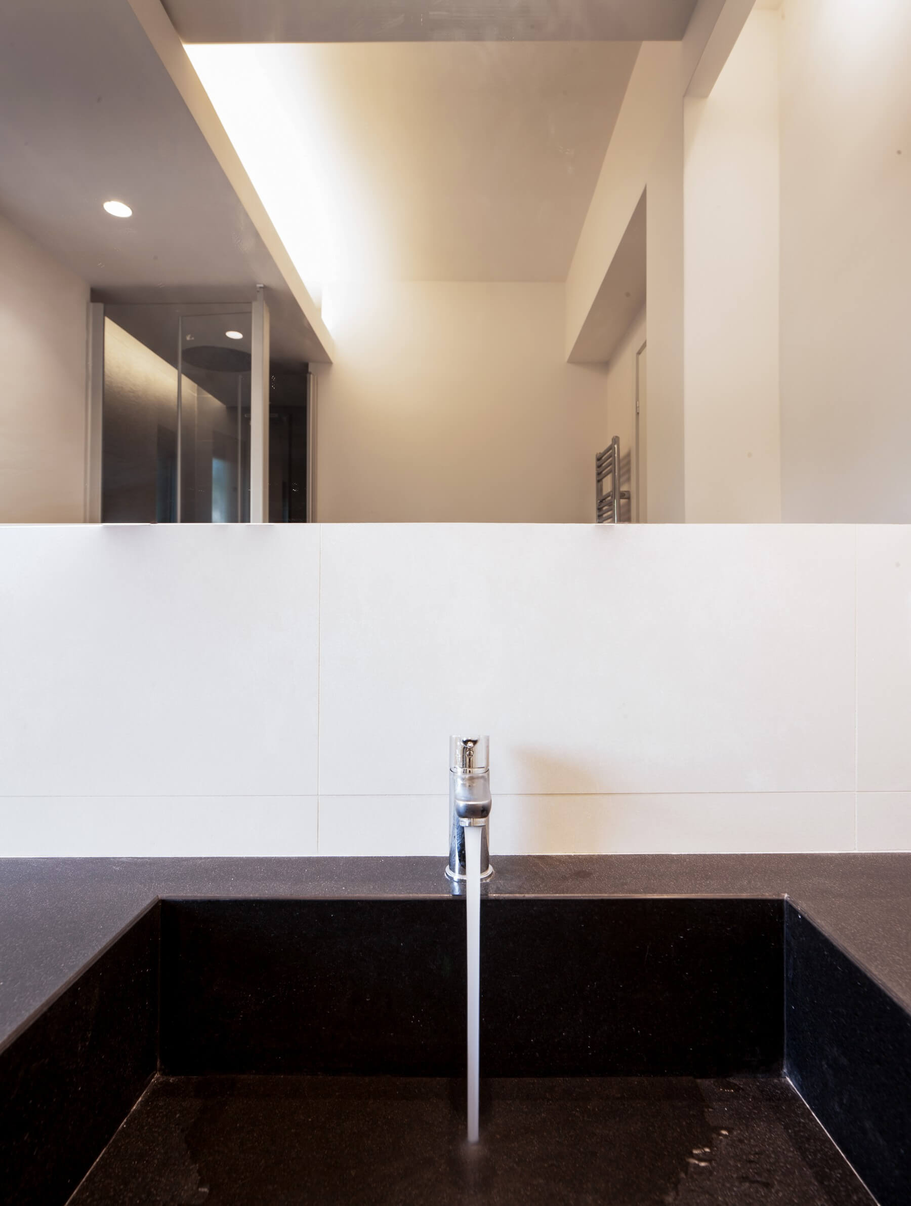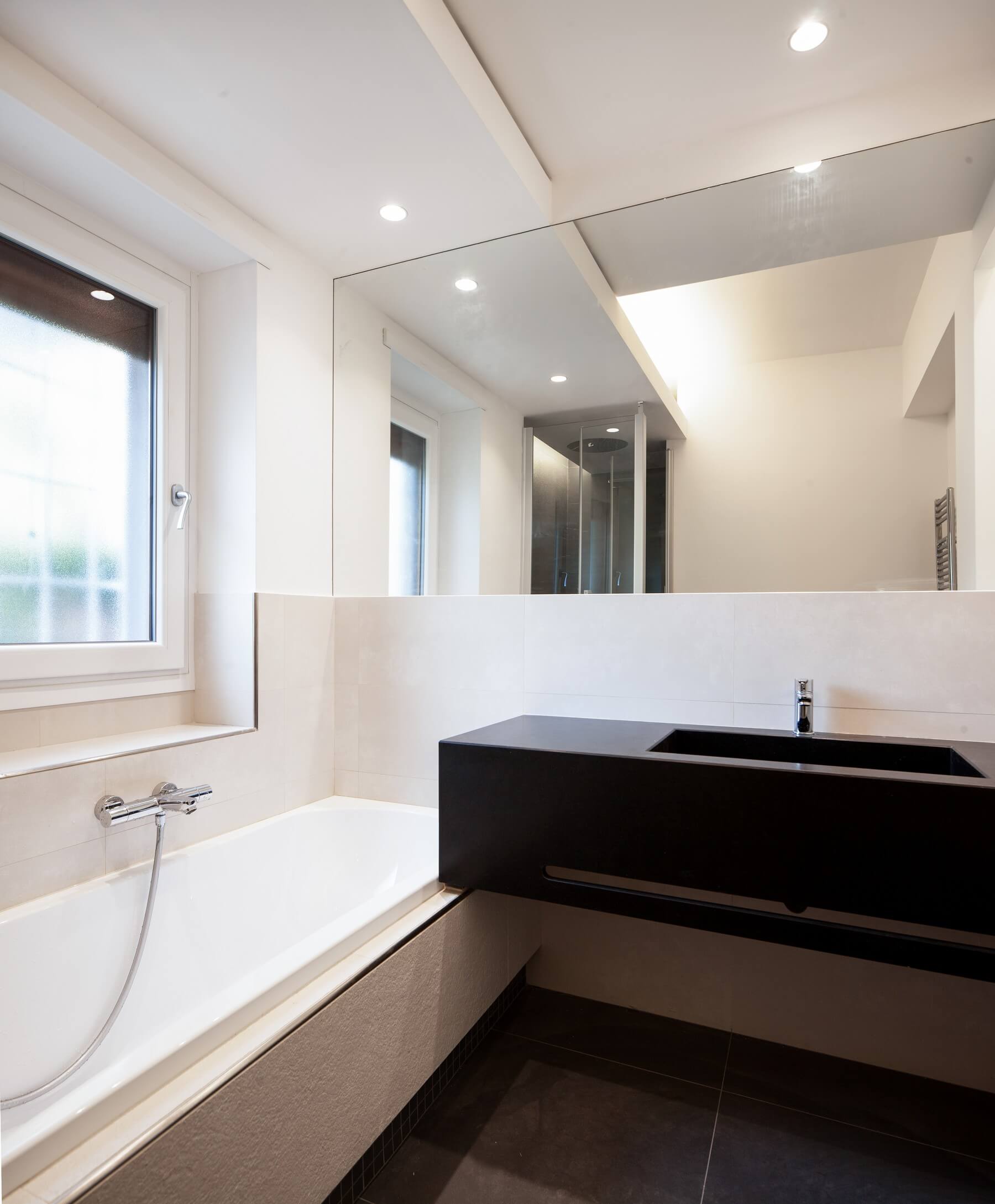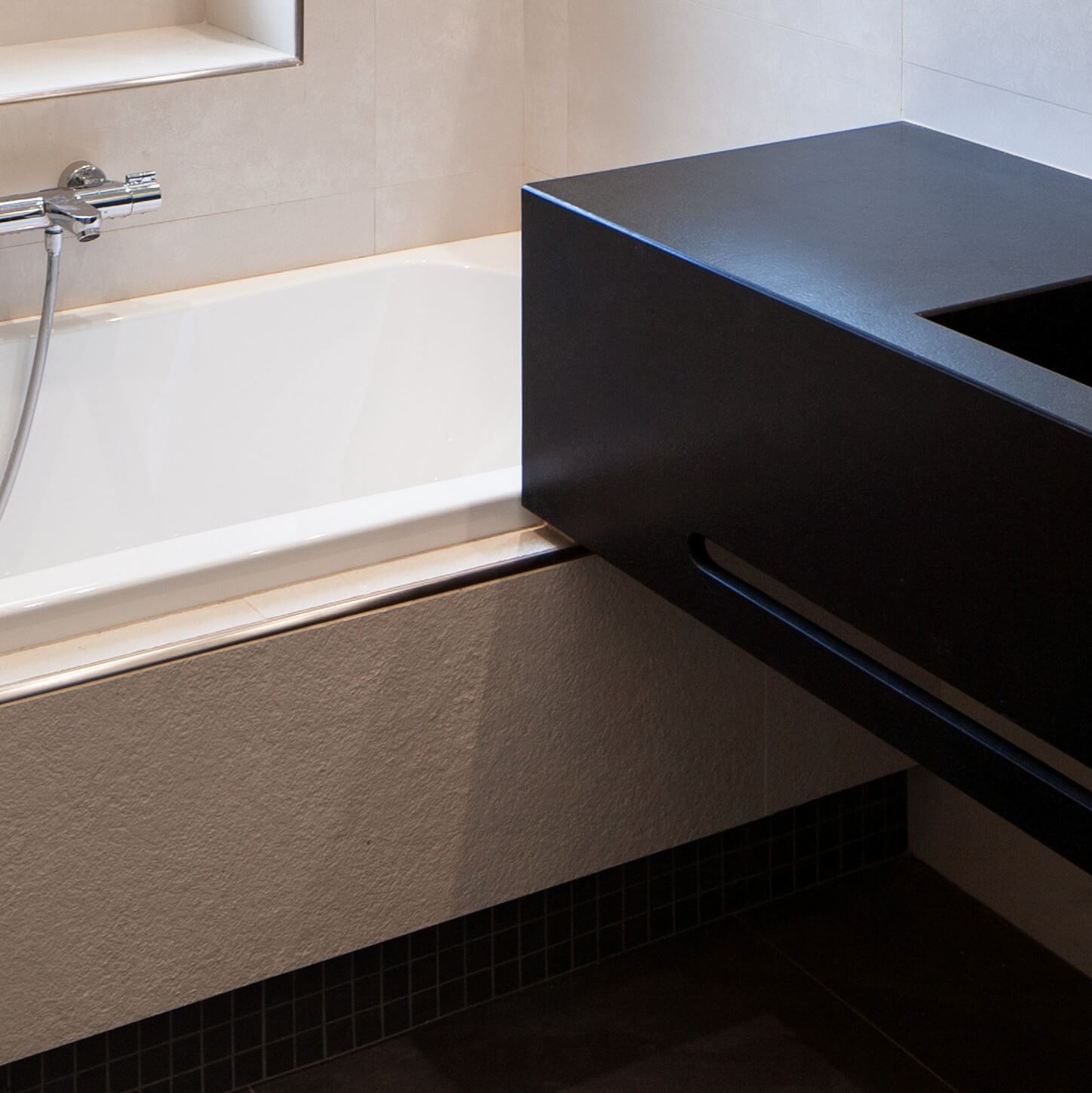 Il monolite come gli altri elementi d’arredo si riflette nelle lastre lucide di marmo Carrara “c” come in uno specchio d’acqua favorendo una forte diffusione luminosa. Leggerezza, evanescenza, riflessione e la forte diffusione luminosa si contrappongono alla massività dell’elemento d’arredo pieno creando un gioco di alternanza tra volumi e vuoti. Tagli luminosi delimitano le transizioni tra le diverse quote dei controsoffitti che caratterizzano gli ambienti. Per i bagni sono state utilizzate pietre in granito nero assoluto e quarzite naturale per i lavabi.