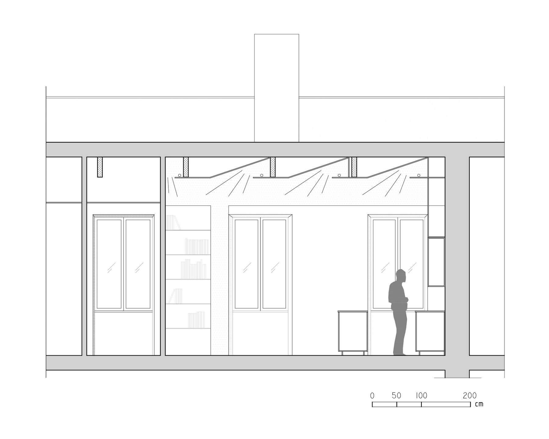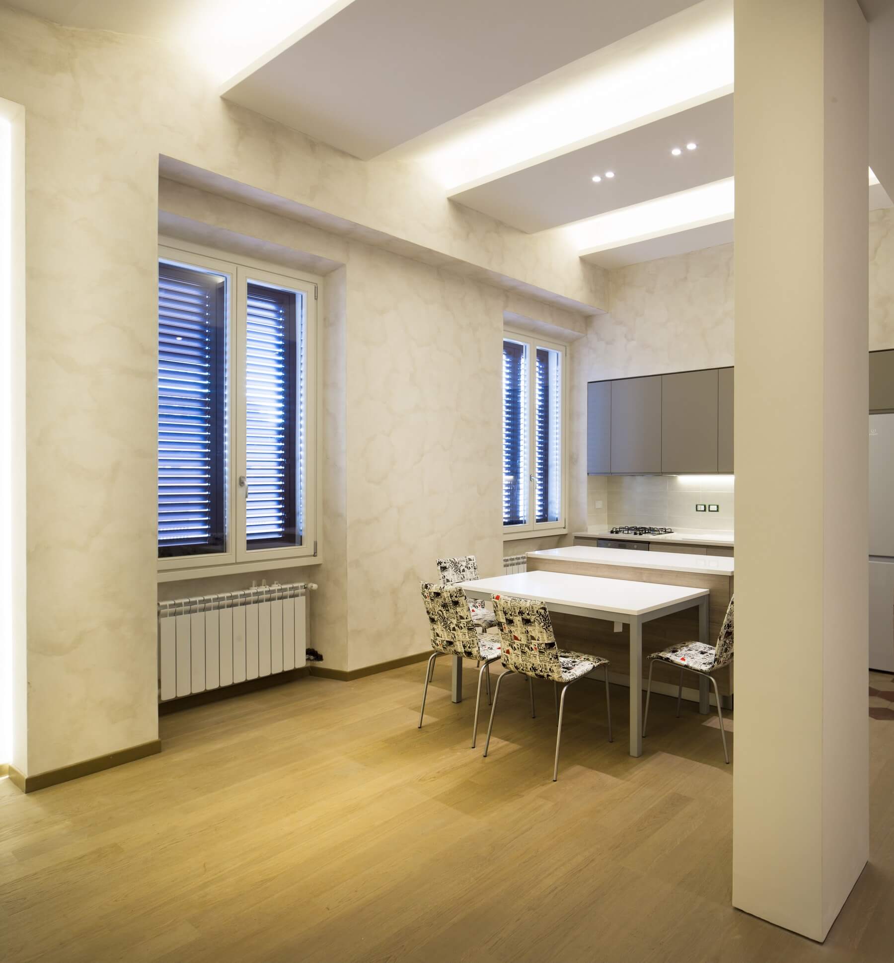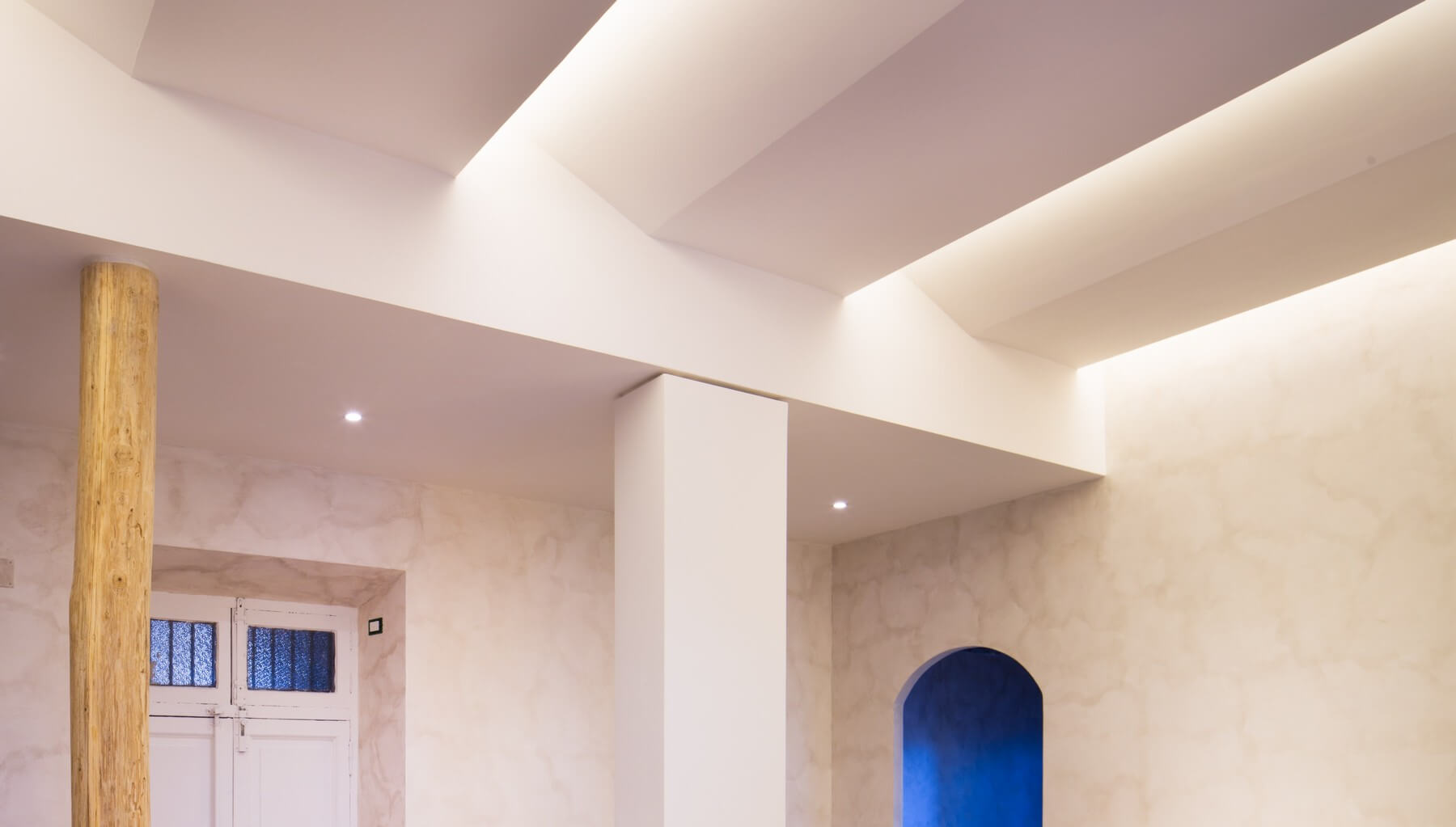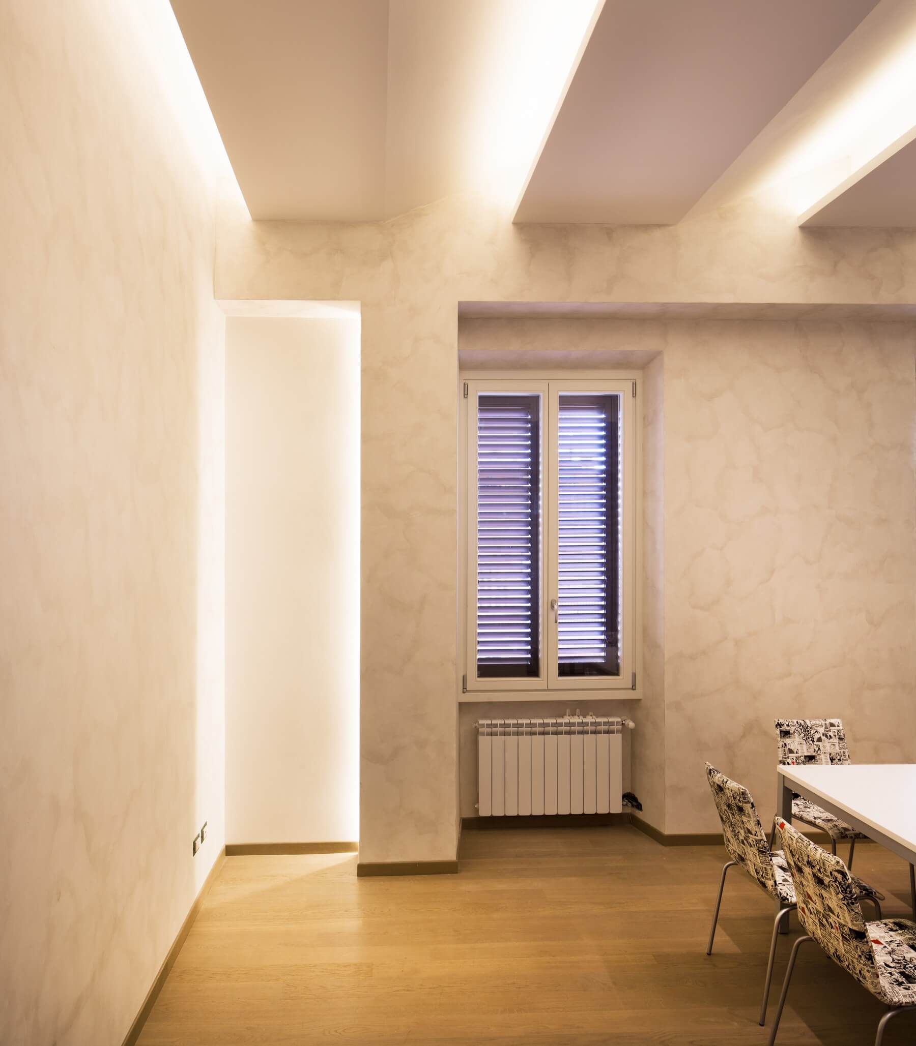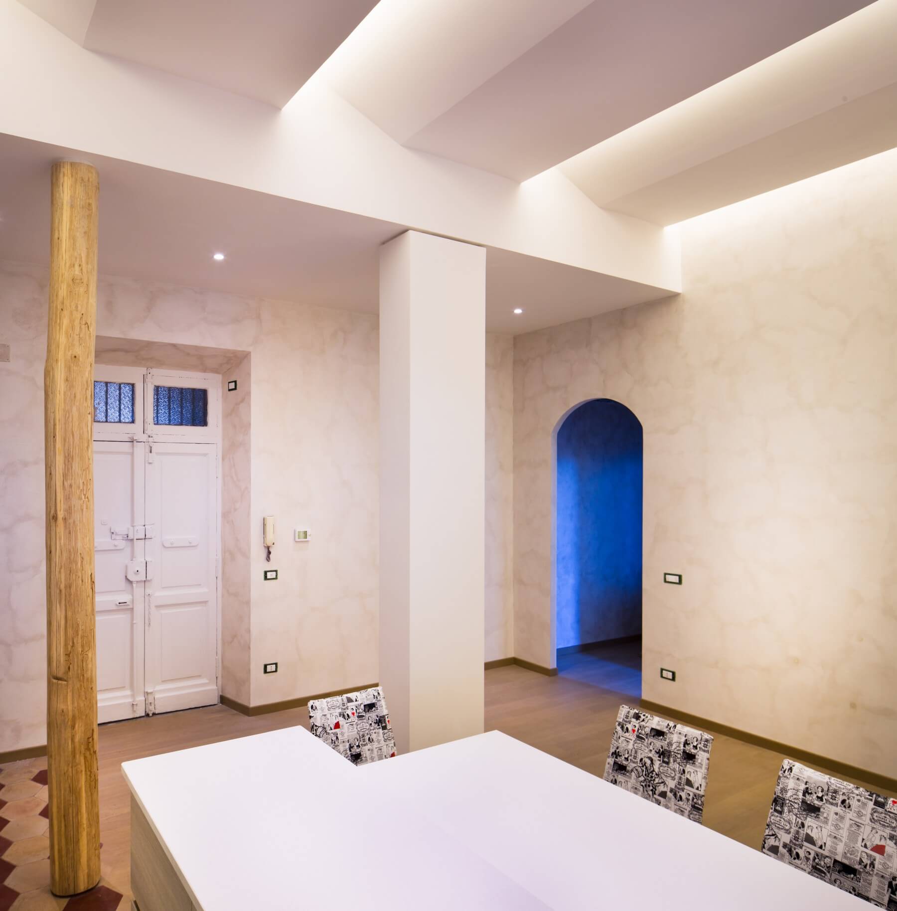 La demolizione di una vecchia camera a canne, che celava delle travi calate in cemento armato, e la notevole altezza, offrono l’occasione per creare un illuminazione insolita nella zona giorno con un gioco di piani inclinati.