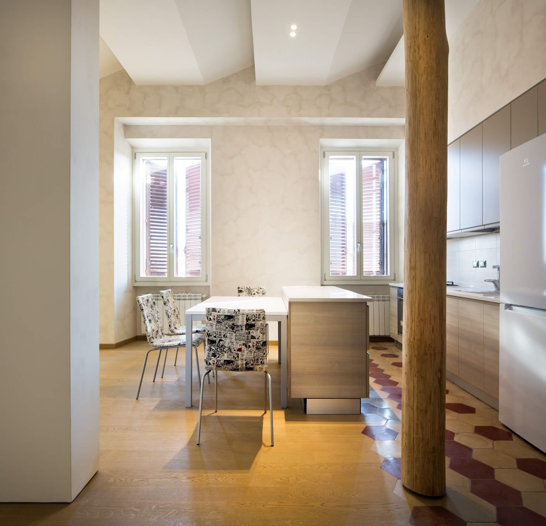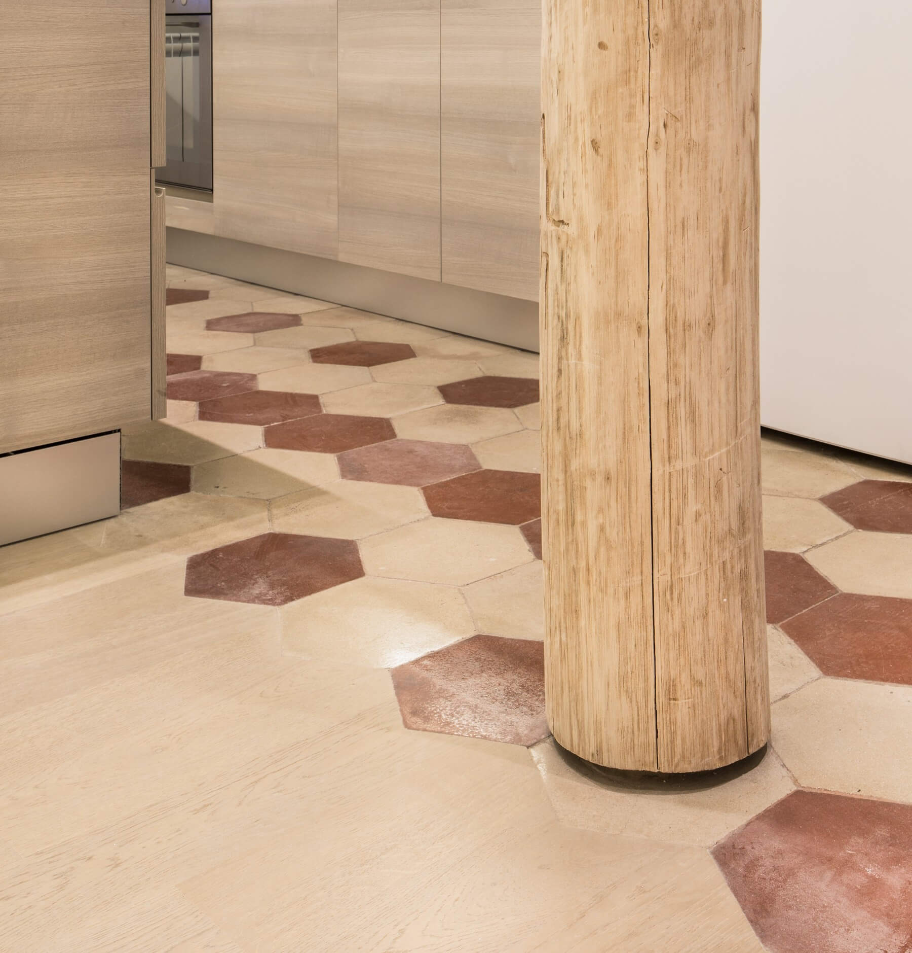 Le cementine, elemento tipico e caratterizzante trovate sotto il pavimento, sono state recuperate e reimpiegate nella zona cucina.