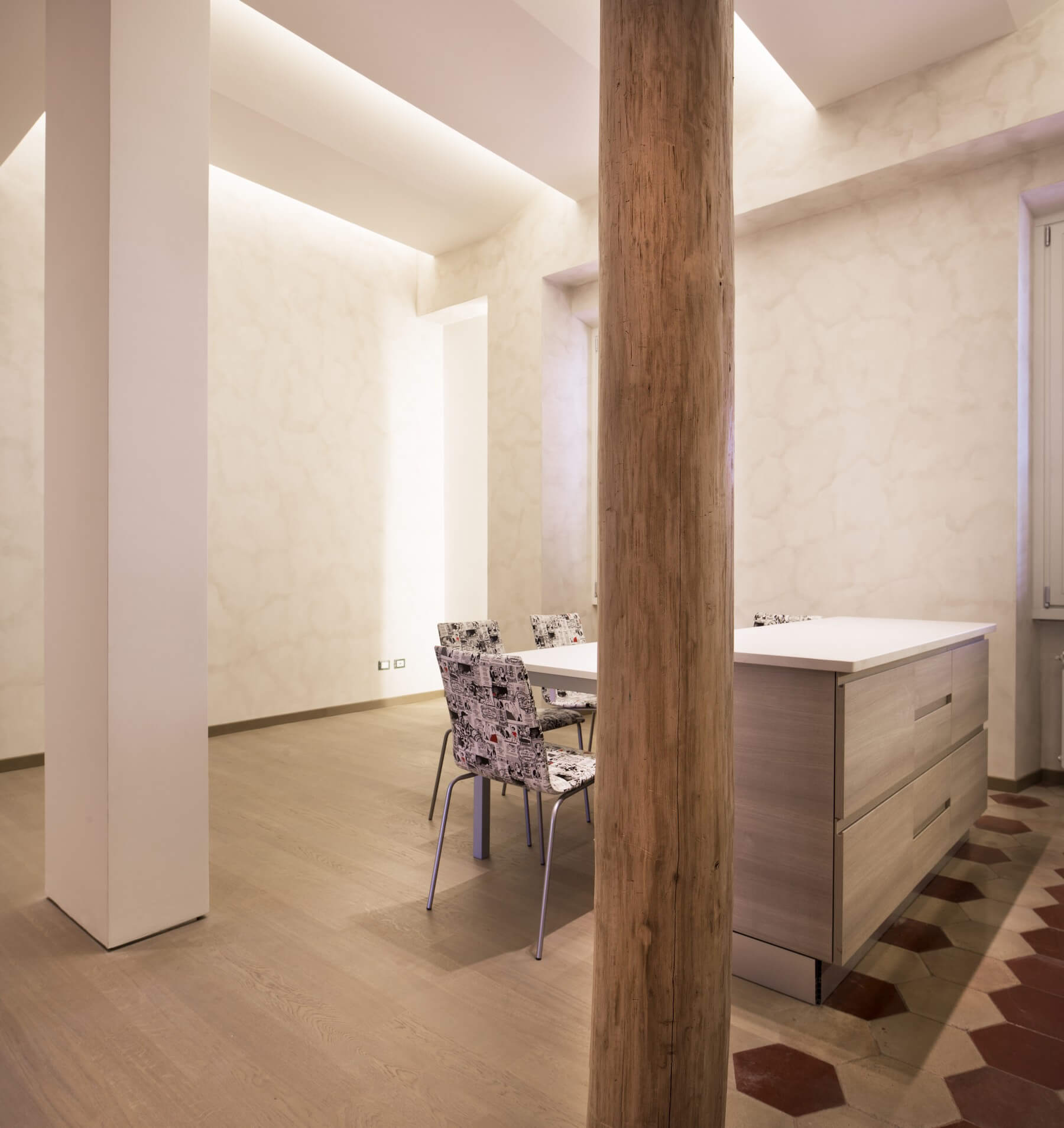 Un tronco di castagno funge da contrappeso alla colonna preesistente definendo idealmente la zona d’ingresso e delimitandola dalla zona giorno.