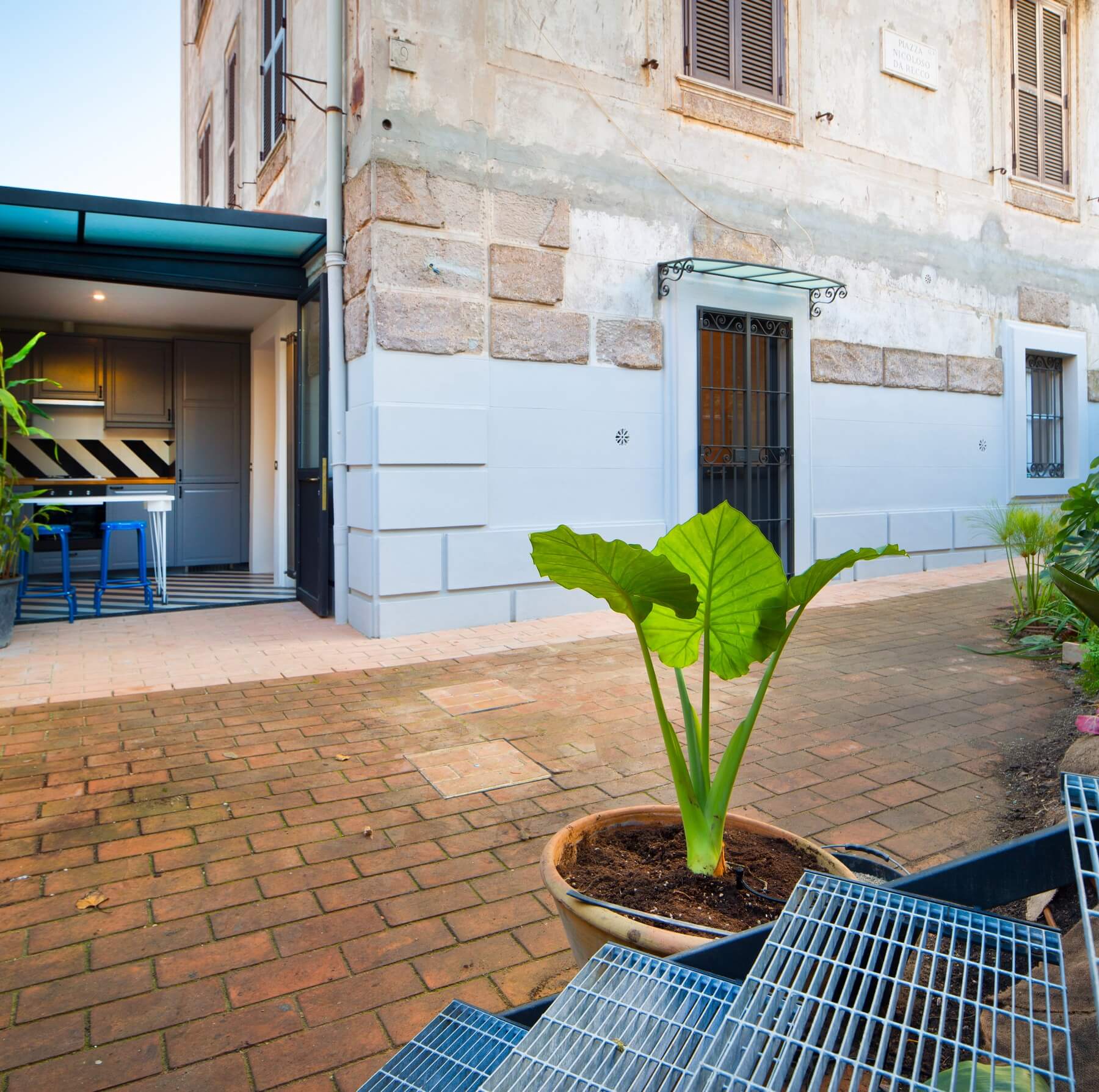 Il giardino viene pavimentato con laterizi pieni. Il movimento sinuoso della pavimentazione crea vasche di terra sulle quale crescono piante diversa essenza.