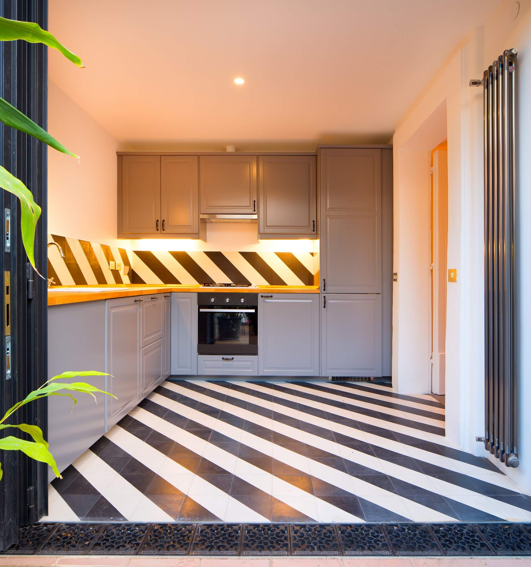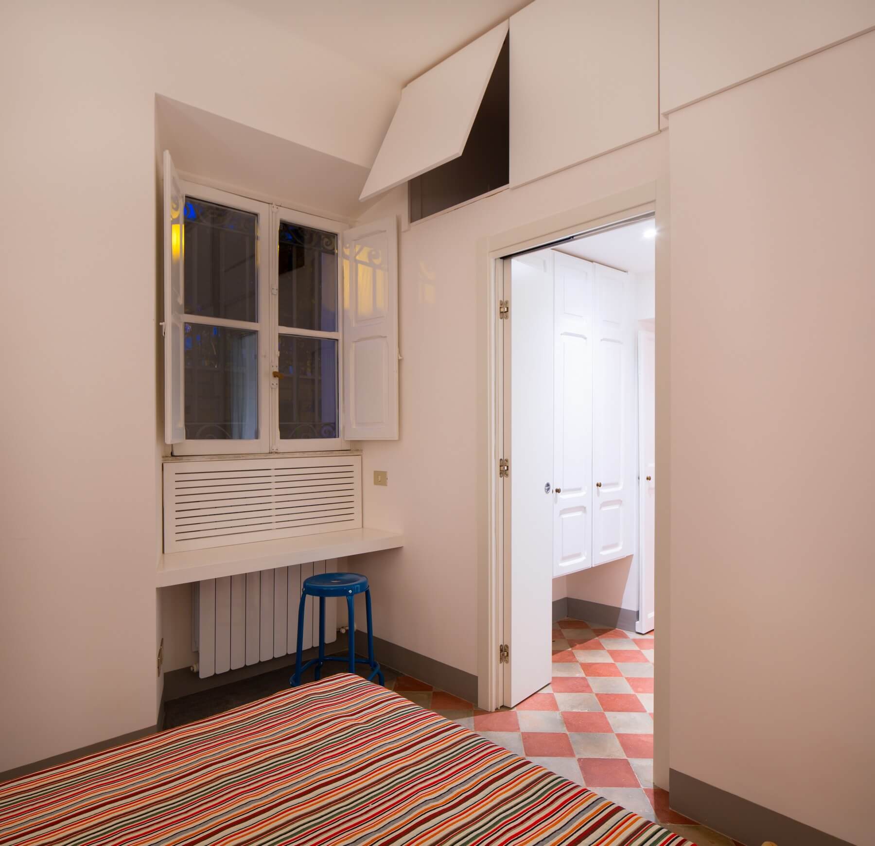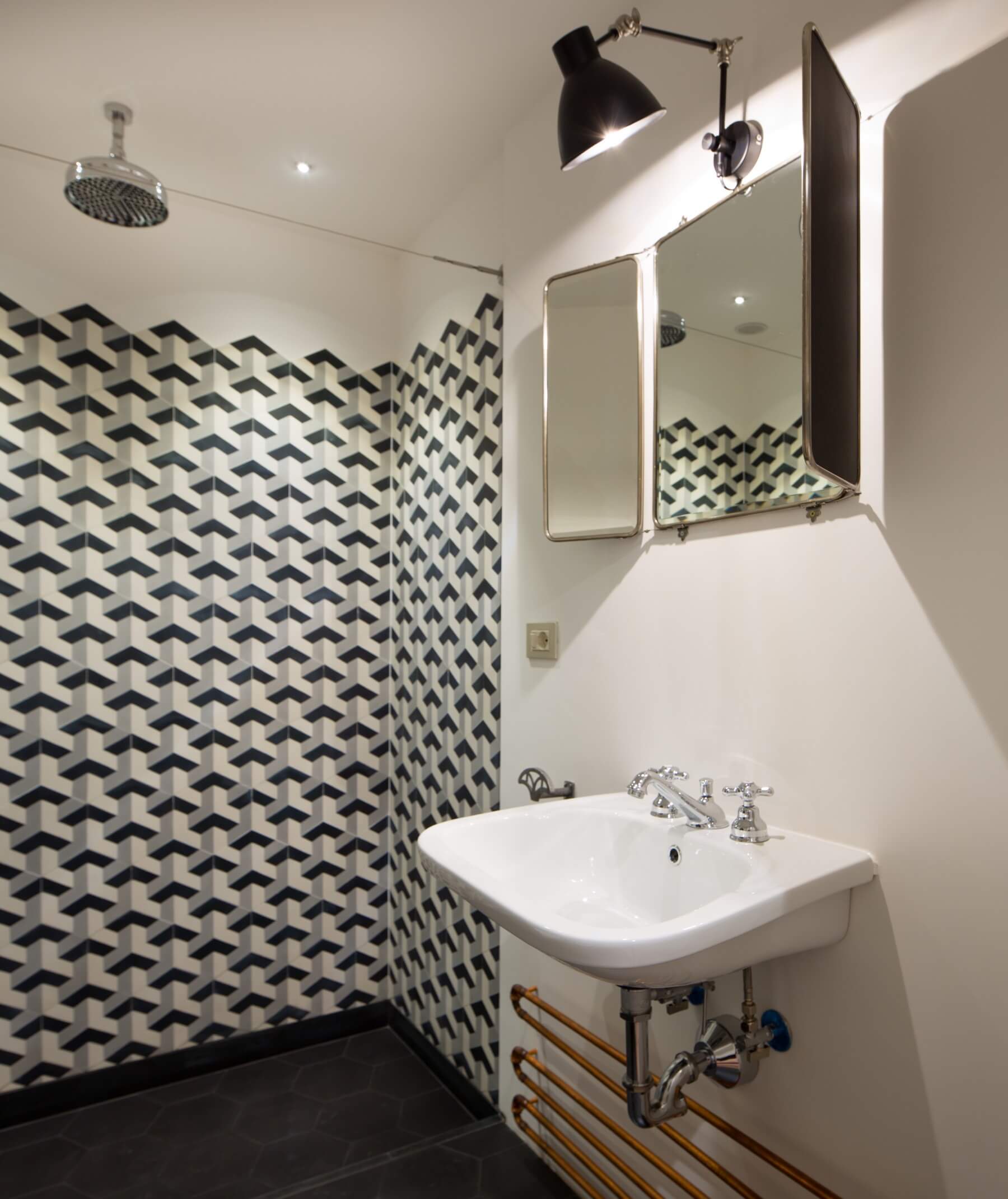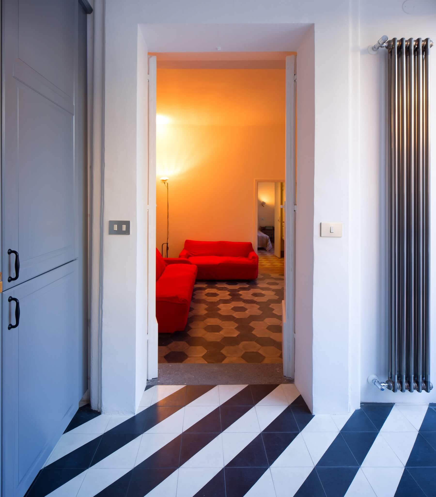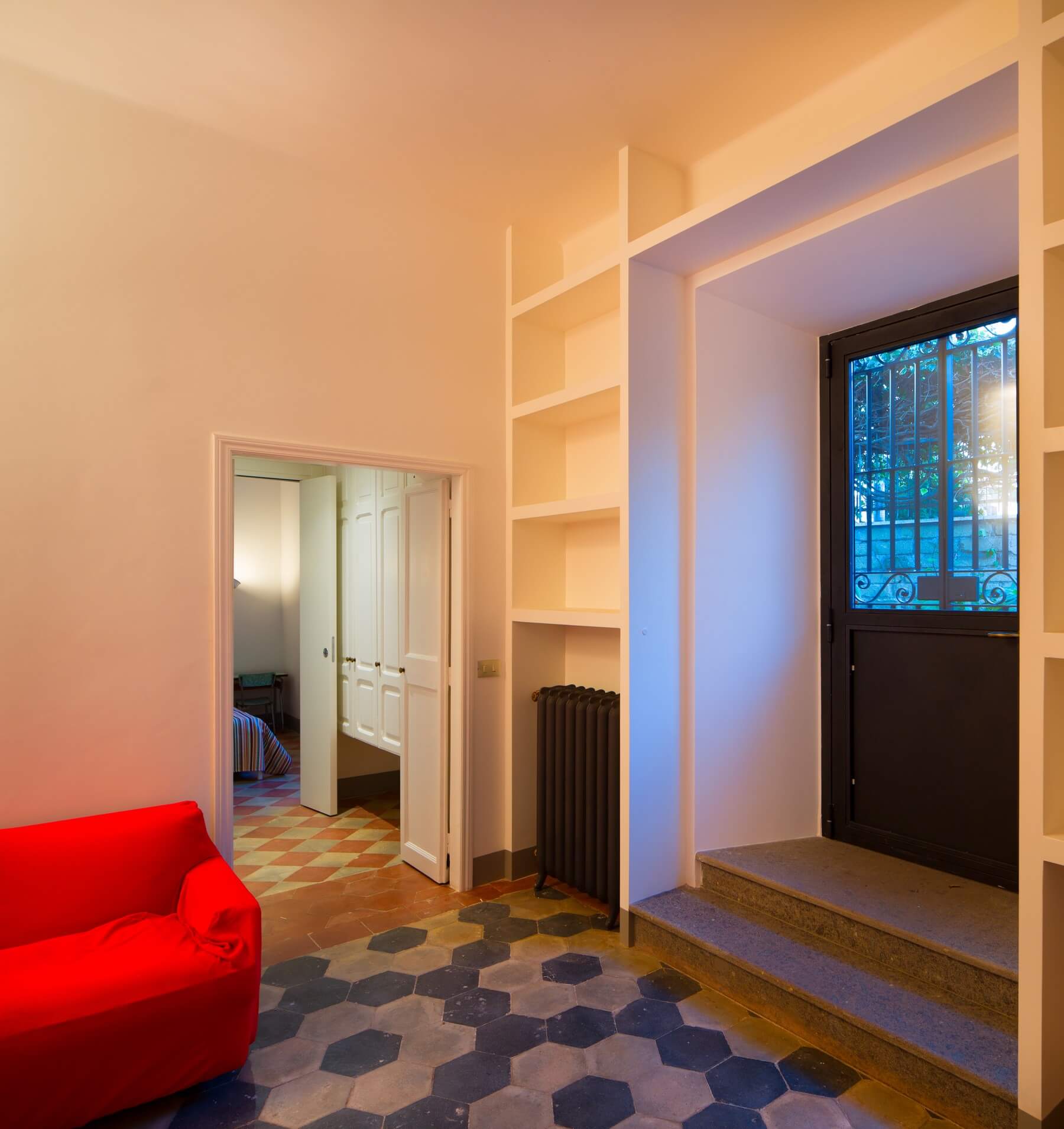 La pavimentazione in cementine di diversa tipologia viene rinvenuta sotto diverse stratificazioni di altra pavimentazione e restaurata. Nuove cementine di produzione contemporanea con effetti “optical”vengono impiegate nella cucina e nel bagno.