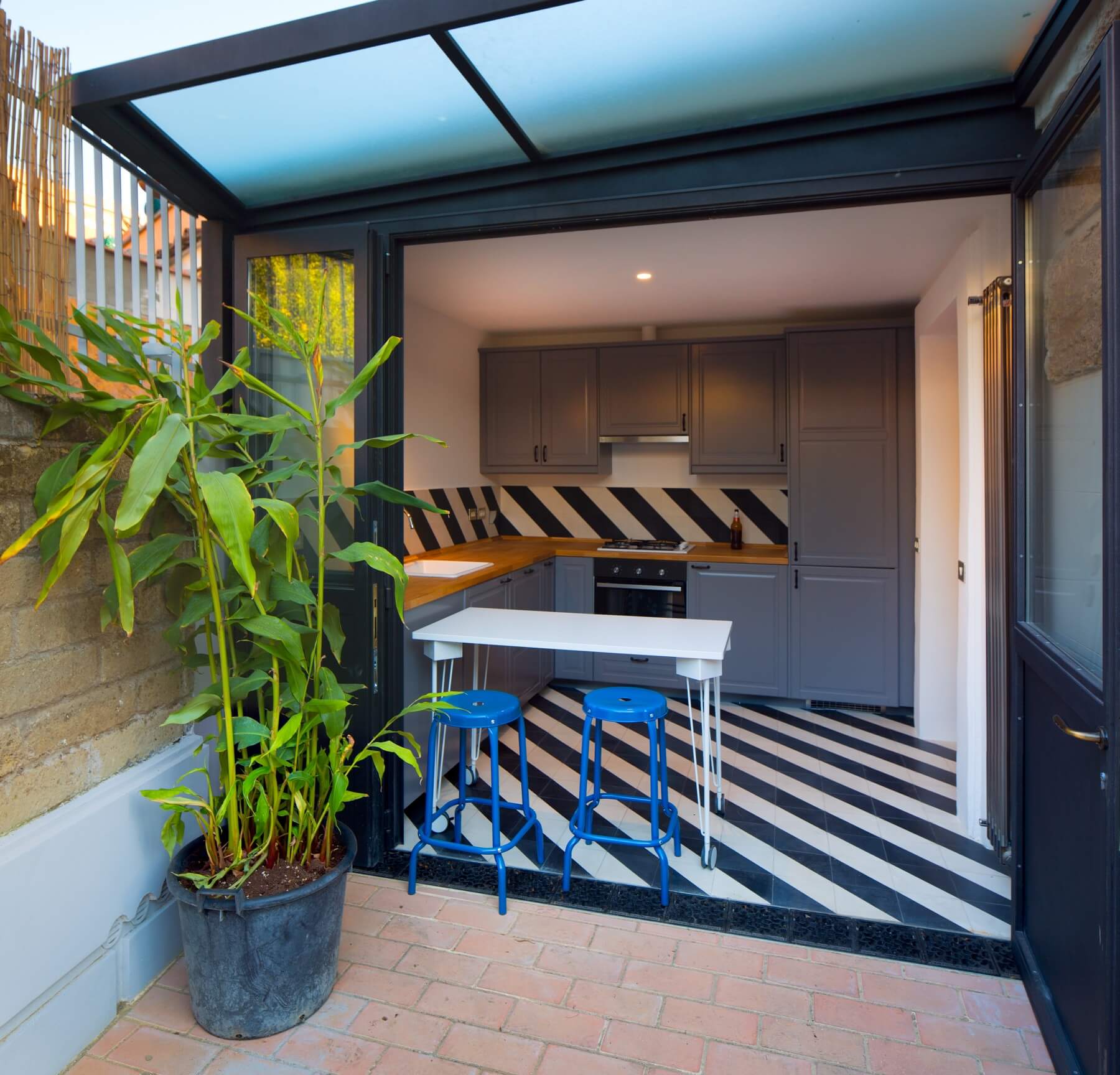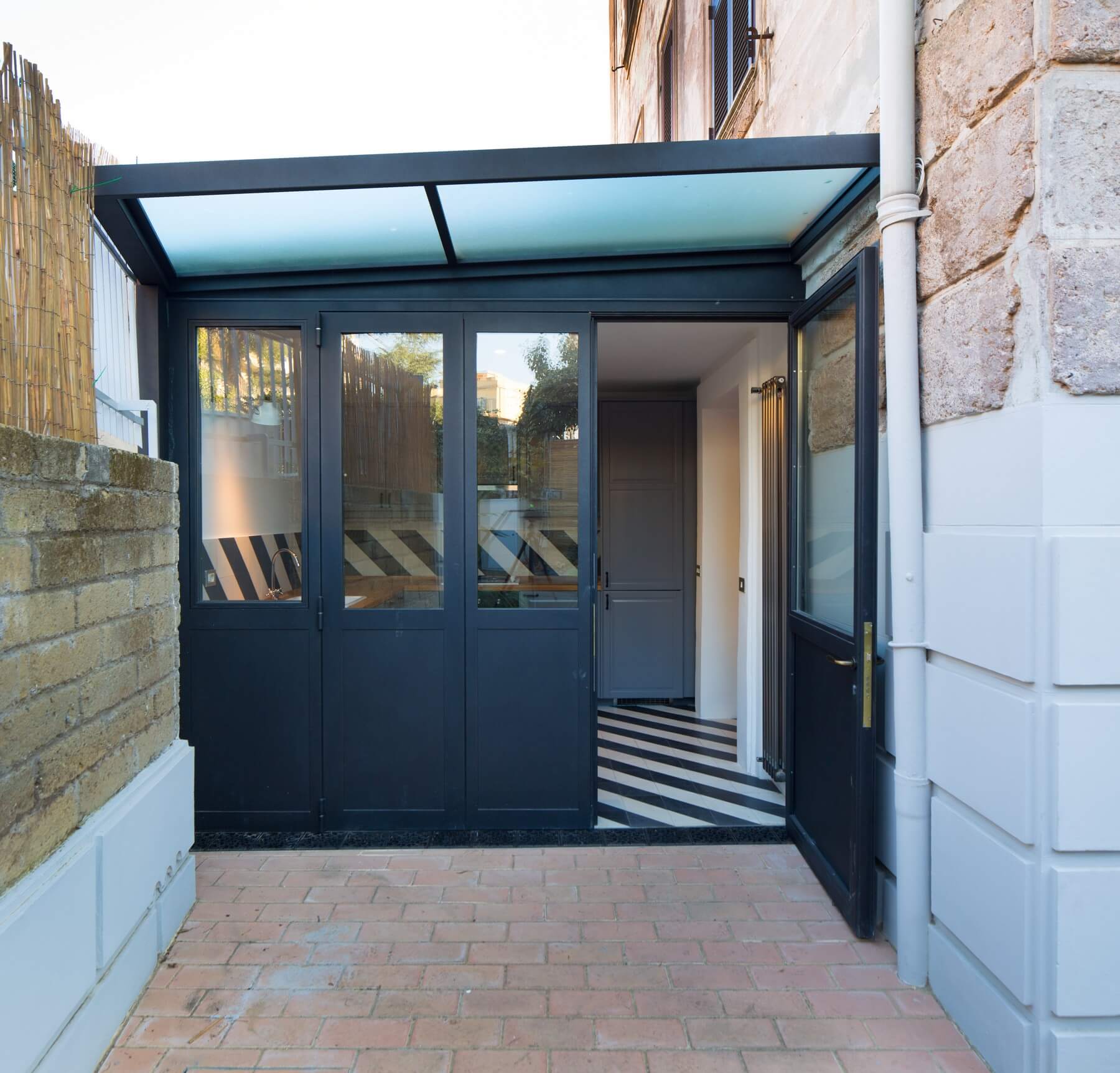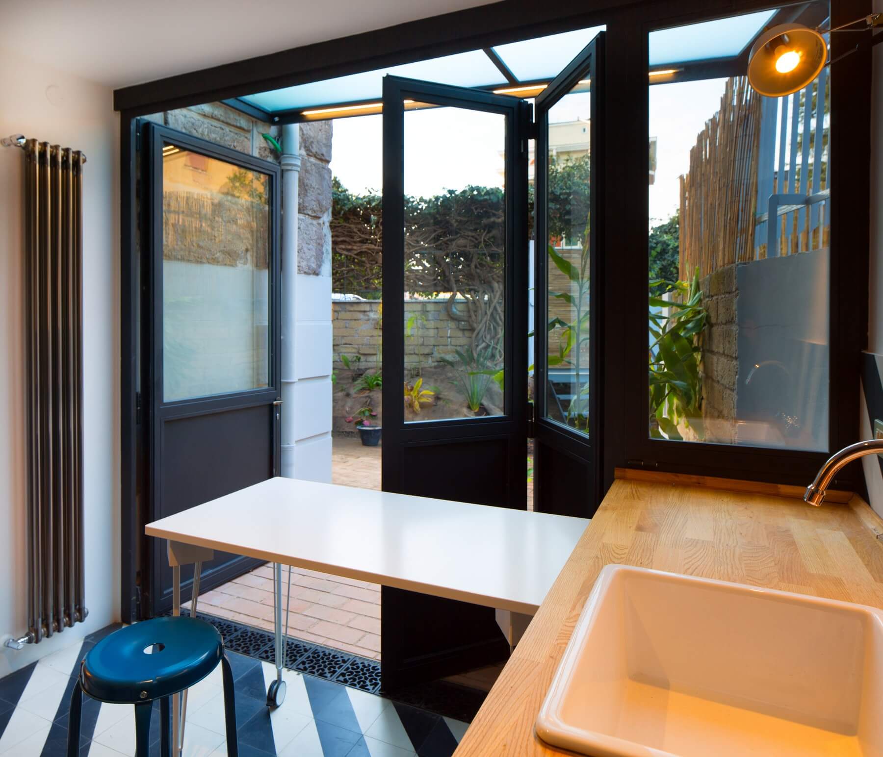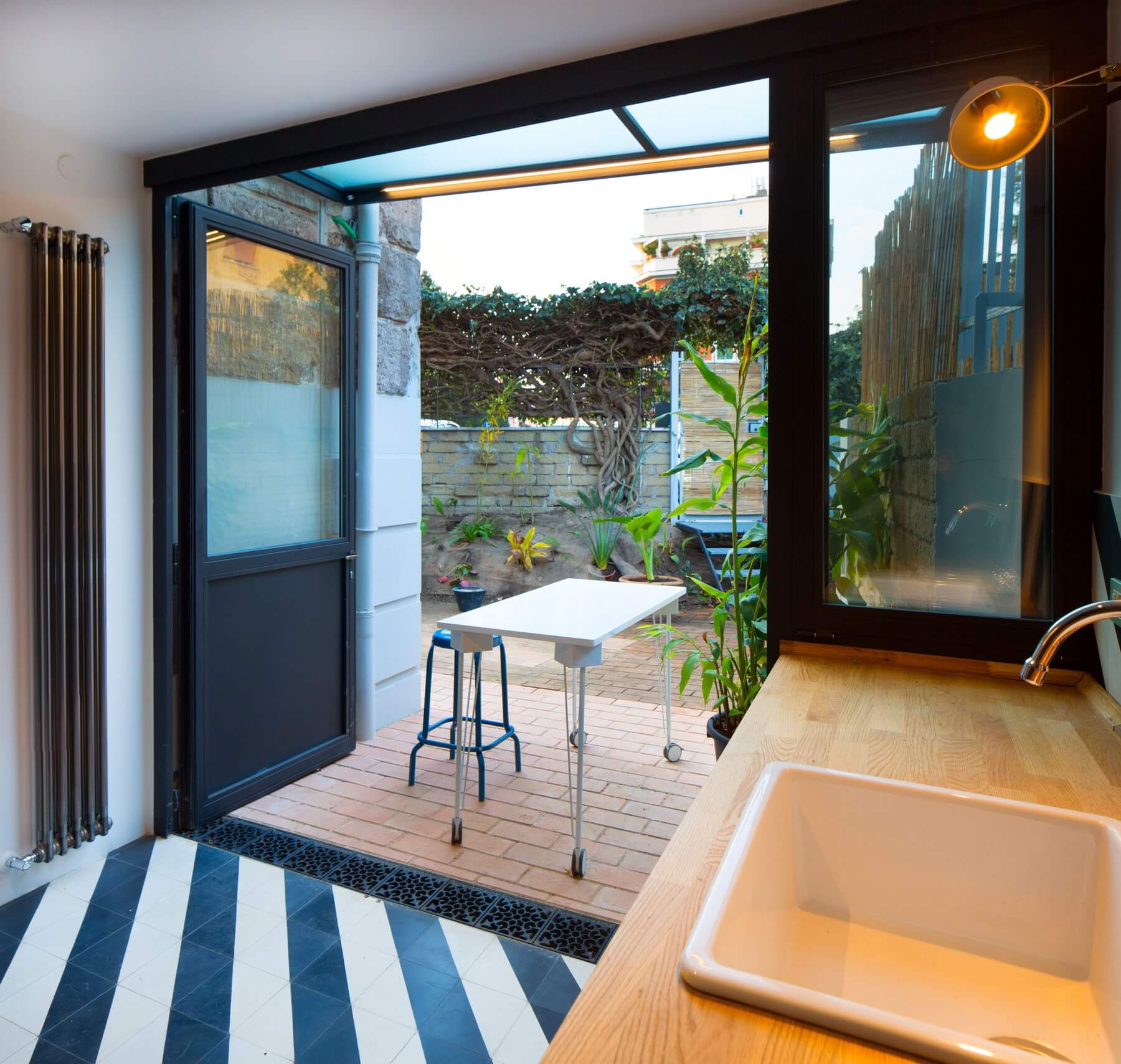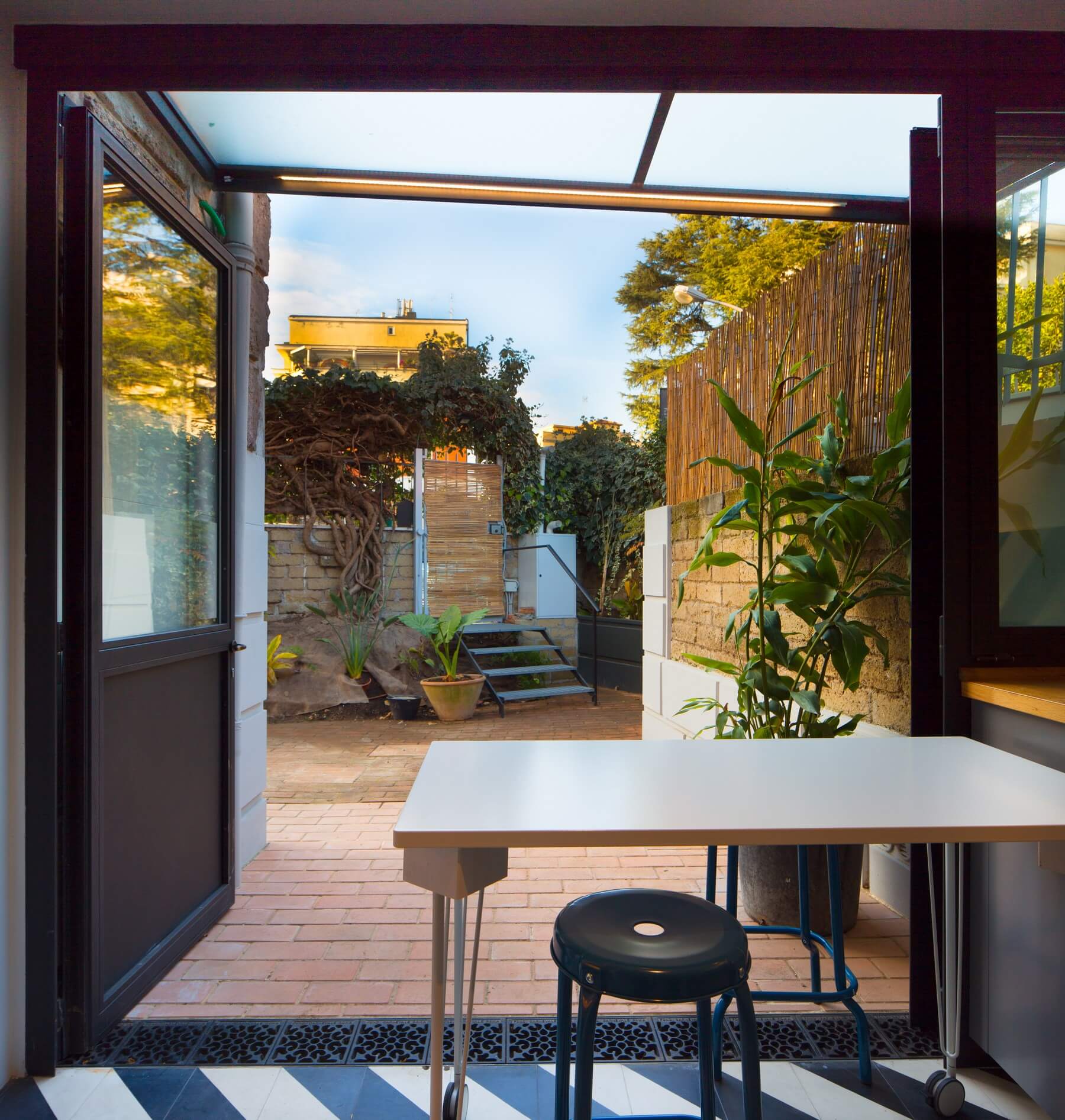 Il volume annesso ospita la cucina posta allo stesso livello del giardino e si trova circa mezzo metro più in alto rispetto al resto dell’abitazione. Viene completamente ristrutturato con realizzazione di una nuova copertura in coppi, e la realizzazione di un sistema ad infissi che all’occorrenza si può impacchettare da un lato ponendo la cucina in continuità spaziale con il giardino.