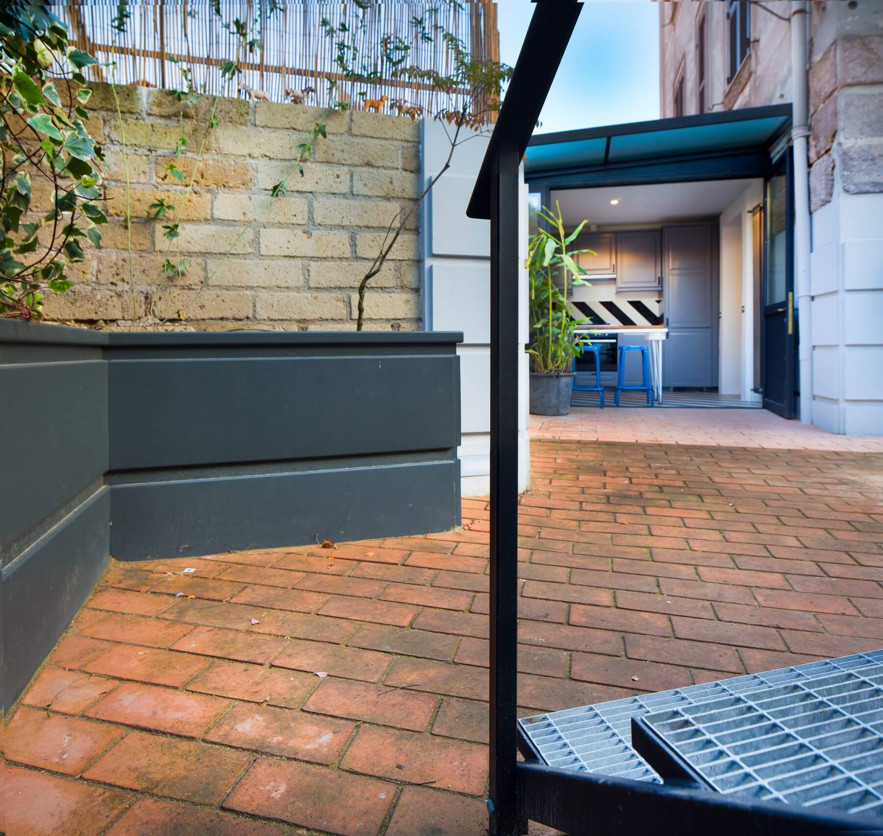 Con uno scavo il piano di calpestio dell’area esterna viene abbassato e portato allo stesso livello del piano della cucina di progetto (volume annesso) mettendo il giardino in maggiore rapporto con gli spazi interni dell’abitazione ai quali si accede attraverso la realizzazione di una porta finestra.