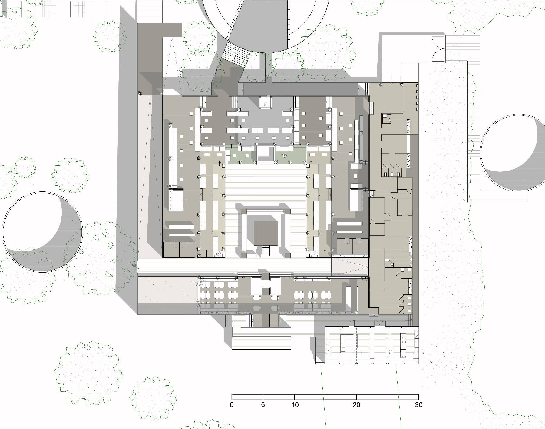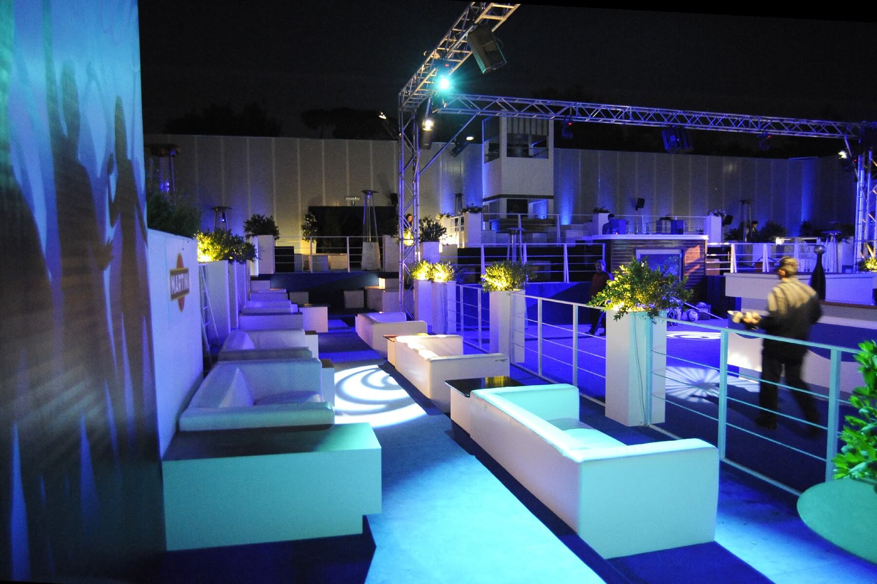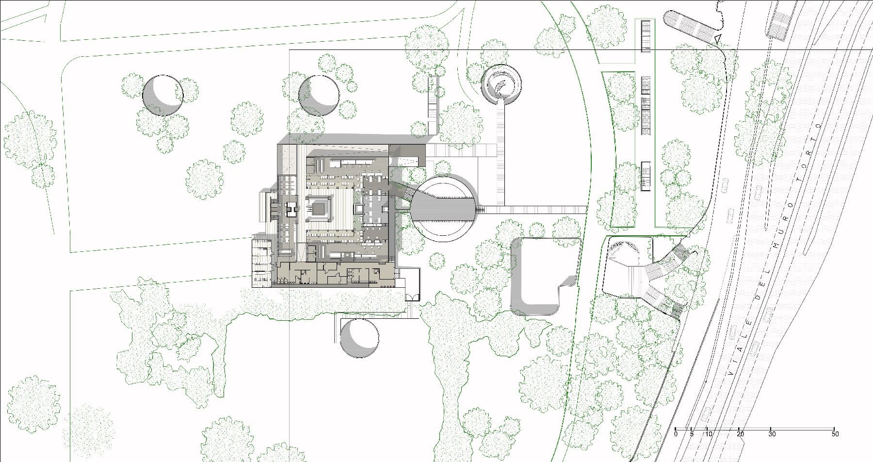 L’edificio delle dimensioni orientative di 45x45m a pianta quadrata, viene realizzato sul terreno in pendenza del parco del galoppatoio di villa Borghese. Il terreno su cui sorge è caratterizzato da differenze di livello che offrono l’occasione per la creazione di una struttura a gradoni definendo ‘diverse terrazze che affacciano l’una sull’altra con un accentramento verso l’enorme bar posizionato al centro della pista posto al livello più basso. Il bar si dispone lungo il perimetro basamentale del palco centrale. La struttura perimetrale di tamponatura viene rivestita con pannelli fonoassorbenti. E’ presente un ristorante con bar annesso e cucine. La realizzazione della grande torre posta al livello più alto costituisce il landmark che dà visibilità all’edificio. Sono presenti n.5 bar tra i quali uno a torre ubicato nella porzione sopraelevata massima del locale. Sono presenti inoltre servizi quali bagni.